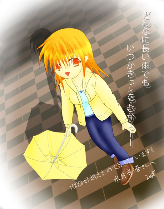 私の我侭リクエスト『雨あがり 傘を持ってる いずみちゃん』(いずみちゃんは、Lastさんのオリキャラだよ)にお付き合いいただき、こんな素敵なイラストを描いてもらっちゃいました^^(感謝、感謝です!)
